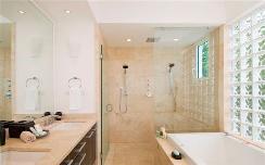 - Shower stalls with glass block & coral tiles